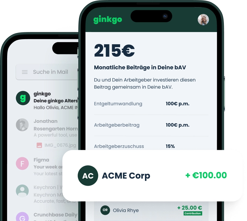 Betriebliche Altersvorsorge ist oft eine Blackbox – kompliziert, intransparent und nach Vertragsschluss meist “aus den Augen, aus dem Sinn”. Die ginkgo App ändert das: Mit intuitivem Onboarding in <5 Minuten, voller Transparenz über die Vertragsentwicklung und umfassender Wissensdatenbank wird bAV endlich verständlich und transparent - und bleibt top-of-mind.